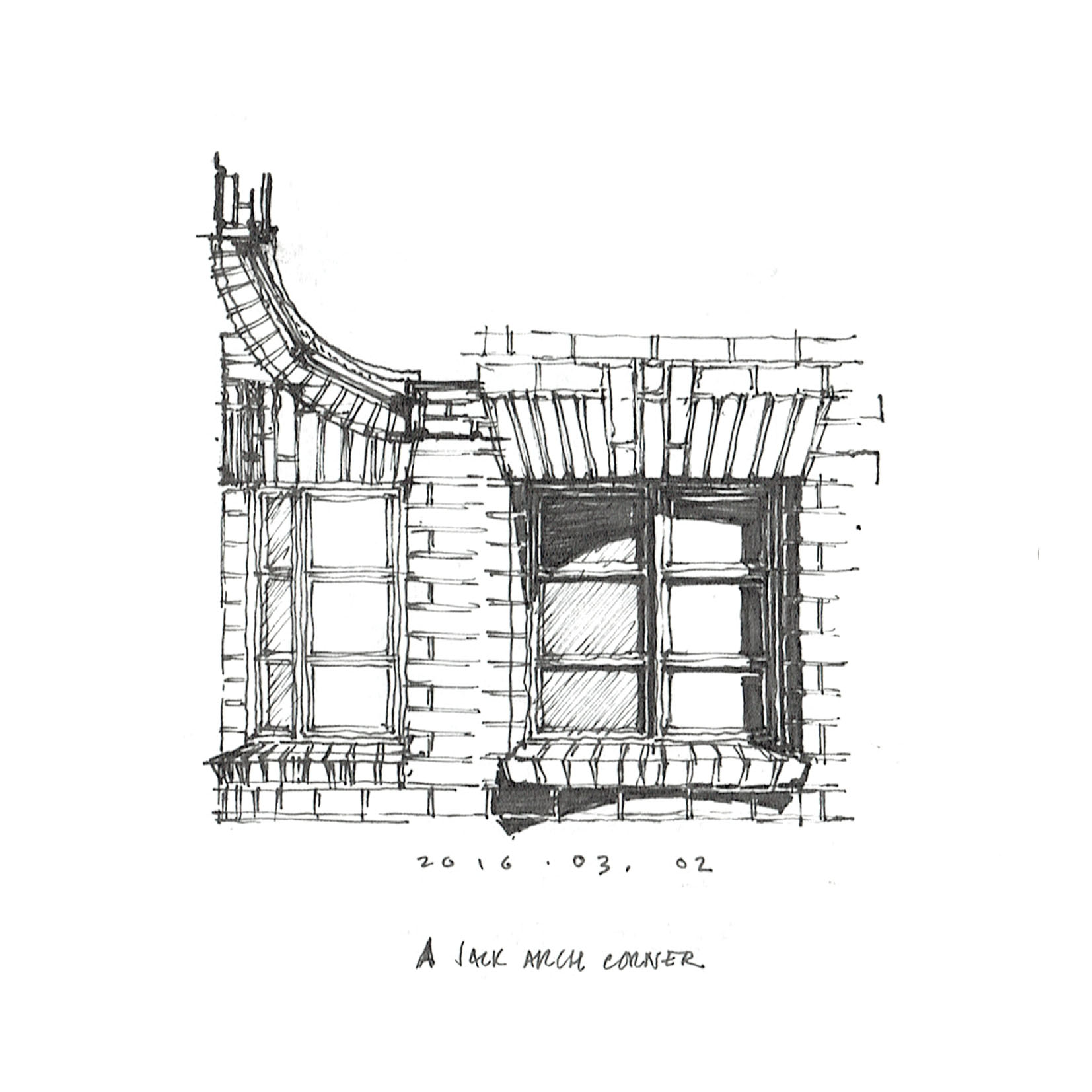 I was digging through my sketchbooks and found a nice little partial wormseye axonometric drawing that should have been a part of an earlier post. This one may be a bit more difficult to understand, seeing as it’s a pretty unusual type of drawing. But effectively, what I’ve done is drawn a corner of the project looking from underneath the building, as if the ground wasn’t there.